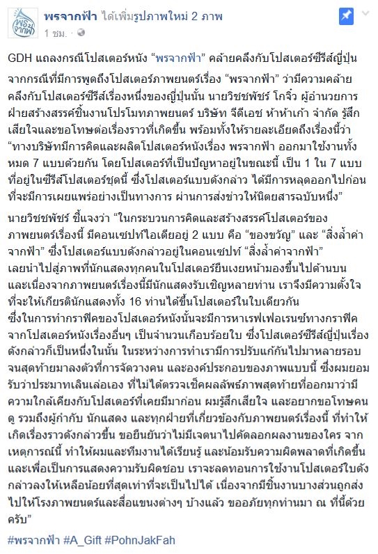 ล่าสุด (17 พฤศจิกายน 2559) ทางค่าย GDH ก็ได้ออกมาชี้แจงถึงเรื่องนี้ผ่านทางเฟซบุ๊กของหนังเรื่อง พรจากฟ้า ว่า จากกรณีที่เกิดขึ้นนั้น นายวิชชพัชร์ โกจิ๋ว ผู้อำนวยการฝ่ายสร้างสรรค์ชิ้นงานโปรโมทภาพยนตร์ บริษัท จีดีเอช ห้าห้าเก้า จำกัด รู้สึกเสียใจและขอโทษต่อเรื่องราวที่เกิดขึ้น พร้อมทั้งเปิดเผยรายละเอียดว่า ตัวโปสเตอร์หนังเรื่อง พรจากฟ้า ถูกทำออกมาใช้งานทั้งหมด 7 แบบด้วยกัน โดยตัวที่เป็นปัญหานั้นได้มีการหลุดออกไปก่อนที่จะมีการเผยแพร่อย่างเป็นทางการ ผ่านการส่งข่าวให้นิตยสารฉบับหนึ่ง โดยทางทีมงานก็ได้หาเรฟเฟอเรนซ์ทางกราฟิกจากโปสเตอร์หนังเรื่องอื่น ๆ เป็นจำนวนเกือบร้อยใบ ซึ่งโปสเตอร์ซีรีส์ญี่ปุ่นเรื่องดังกล่าวก็เป็นหนึ่งในนั้น ในระหว่างการทำเรามีการปรับแก้กันไปมาหลายรอบ จนออกมาในรูปแบบดังกล่าวและยอมรับว่าเป็นการประมาทเลินเล่อของตนเองที่ไม่ได้ตรวจเช็กให้ดีก่อน พร้อมยืนยันว่าไม่มีเจตนาไปคัดลอกผลงานของใคร